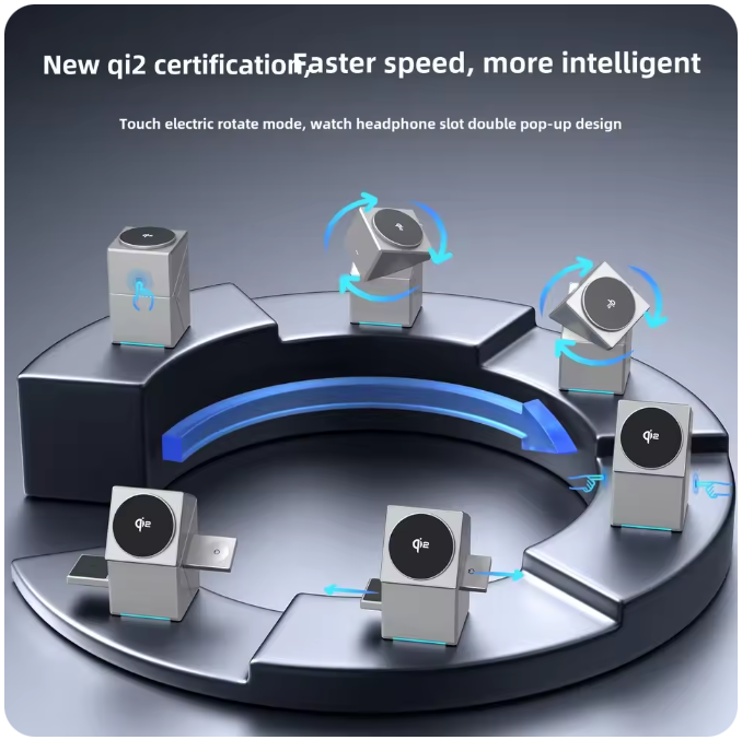 The auto-rotating magnetic pad adjusts for optimal viewing in both portrait and landscape modes, making it ideal for desk use, bedside charging, or video calls. Built with Qi2 wireless fast-charging support (up to 15W), it delivers efficient, stable power while keeping your devices neatly organized.